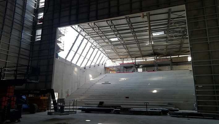 - Création d’une salle de 673 places. Espace scénique adossé fixe